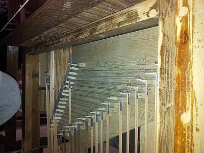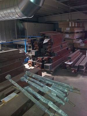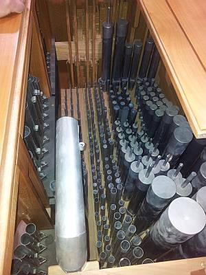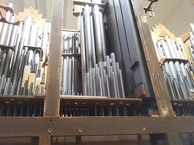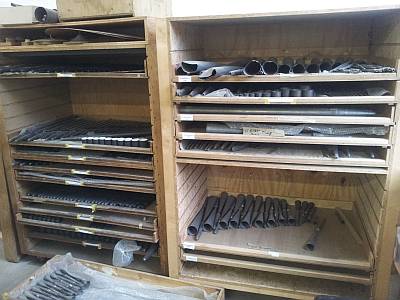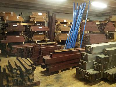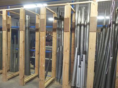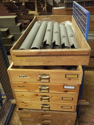 Im Lagerbereich werden viele verschiedene Typen von gebrauchten Orgelpfeifen gelagert, die für eine spätere Restaurierung aufgehoben werden.