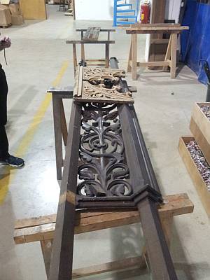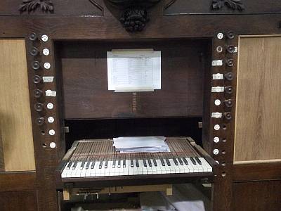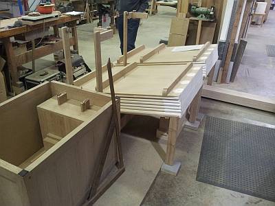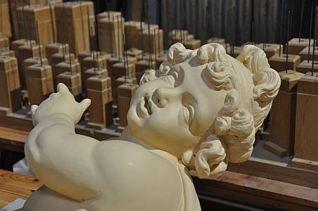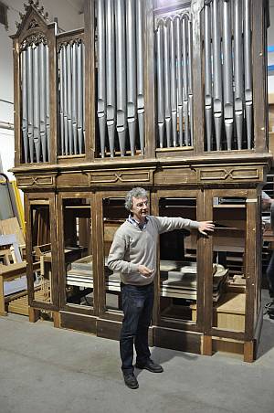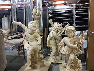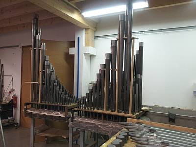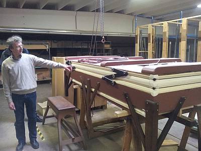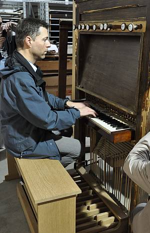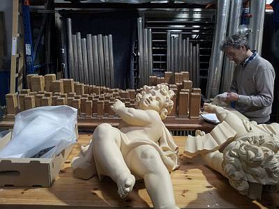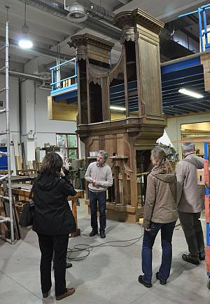 Die unten abgebildete Orgel wird momentan restauriert und ist bereits bespielbar. Da das Gehäuse noch nicht vollständig geschlossen ist, sind die mechanischen Abläufe beim Spielen nachvollziehbar. Nebenan werden Figuren eines Instruments bearbeitet.