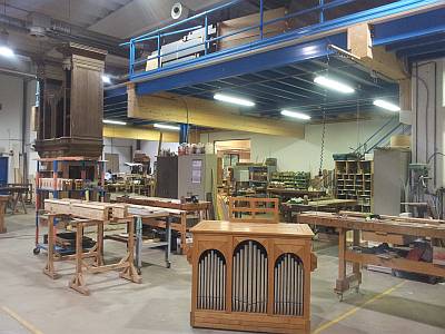 In der Montagehalle mit benachbarter Holzwerkstatt werden historische Orgeln restauriert und Neubauten angefertigt. Spieltisch, Windlade und Balg sind bei jeder Orgel individuell aufgebaut. Für die Bearbeitung sind umfangreiche Fachkenntnisse und Erfahrung unerlässlich.